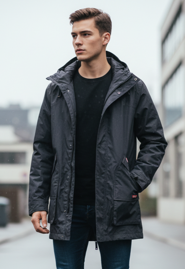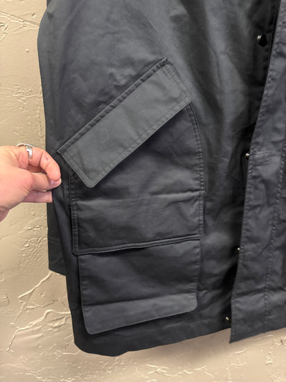 Description : Black hooded parka-style jacket with a front zipper and storm flap, two large flap pockets at the hips, long sleeves with snap cuffs, and a slightly longer hem for coverage.