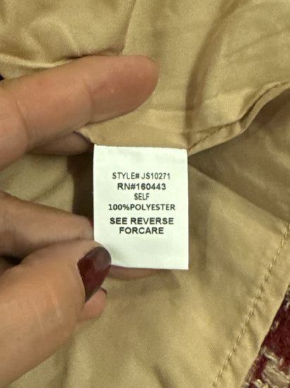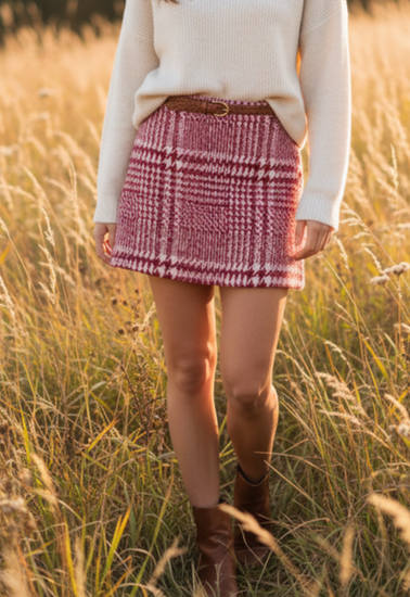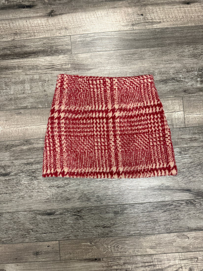Description : New with tags A-line mini skirt in a textured tweed/knit fabric featuring a red and cream large-scale plaid pattern and a straight waistband with a slightly fuzzy finish.
