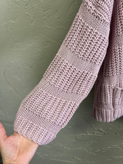 Description : Chunk knit cardigan in a beautiful lilac color. Open front with a single button closure, oversized fit, textured pattern, two front patch pockets, long sleeves with ribbed cuffs, ribbed hem at the bottom, casual style