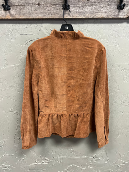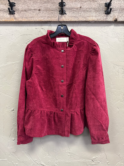 Description : Corduroy style jacket with a round neckline, ruffled collar, and button closure down the front, featuring long sleeves and a peplum hem.