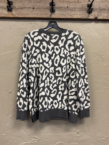 Description : New with tags, long-sleeve crewneck sweater in charcoal gray with a high-contrast white leopard jacquard all-over pattern, featuring ribbed neckline, cuffs, and hem. The knit has a slightly relaxed fit and visible texture from the jacquard weave