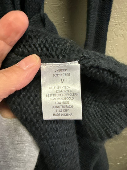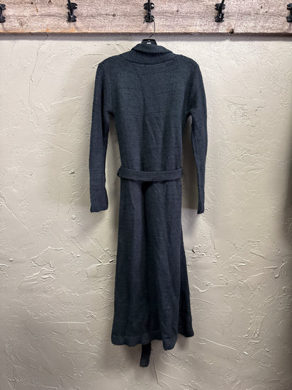 Description : New with tags, long deep slate blue knitted cardigan with a shawl collar, long sleeves, open front and a self-tie belt at the waist; the fabric is textured and cozy.