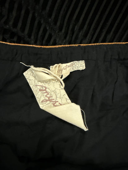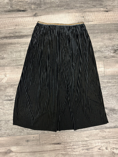 Description : Midi-length pleated skirt in a shiny black fabric with narrow vertical pleats and a gathered elastic waistband featuring a metallic gold striped detail Measurements are taken from the size MEDIUM