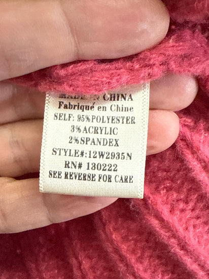 Description : New with tags, chunky knit turtleneck sweater in a bright pink color with a ribbed, textured stitch pattern, long sleeves with fitted cuffs, and a slightly cropped hem.