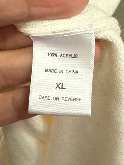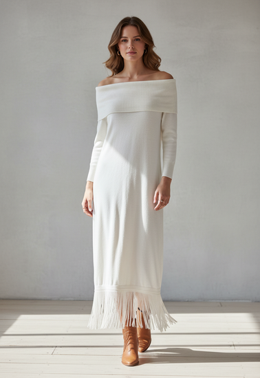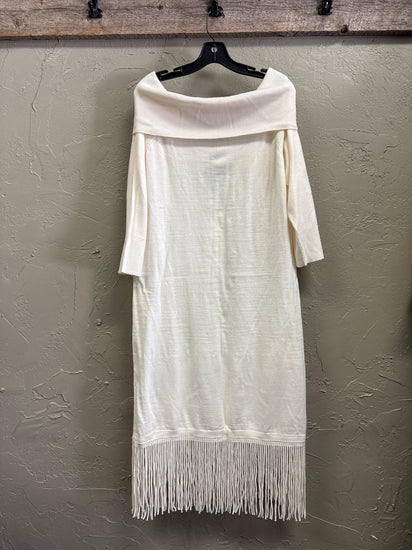 Description : New with tags off-the-shoulder sweater dress in a soft winter white with a wide folded neckline, three-quarter sleeves, straight midi length and long fringe trim along the hem