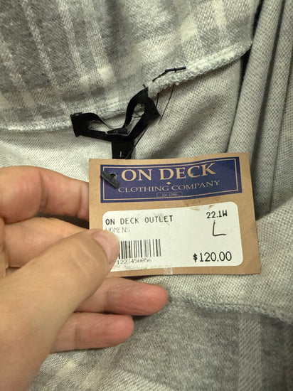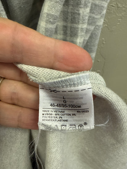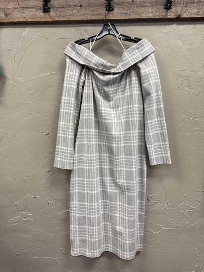 Description : Off-the-shoulder, knee- to midi-length dress in a soft grey and white plaid knit with long sleeves and a wide fold-over neckline that exposes the shoulders.