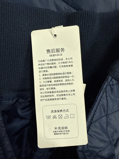 Description : New with tags puffer leggings in a blue with horizontal quilted padding and a smoother, darker side panel; they feature a high waistband with visible seam lines and a slim, tapered leg shape.