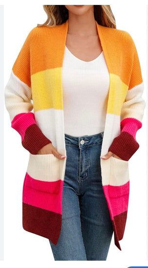 Description : Open-front longline cardigan sweater with wide horizontal color-block stripes in orange, mustard yellow, cream, blush, fuchsia and burgundy, featuring long sleeves, front patch pockets and a ribbed knit texture