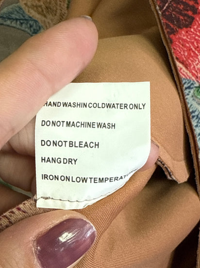Description : New with tags, Anthropolgie sleeveless long ultra-suede vest in a beautiful taupe color with a notched lapel and open front. It features large multicolored embroidered floral motifs in pink, green and gold tones along the lower front panels.