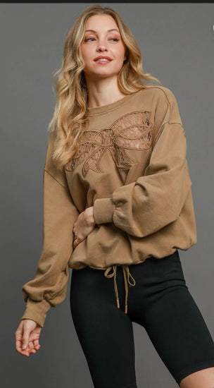 Description : New with tags. Get cozy and chic in their Latte Washed Sweatshirt! Made with 100% cotton and mineral washed for extra softness, you'll never want to take it off. The lace ribbon embroidery on the front adds a touch of femininity, making this sweatshirt perfect for any occasion - from lounging at home to running errands in style!