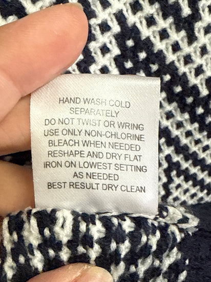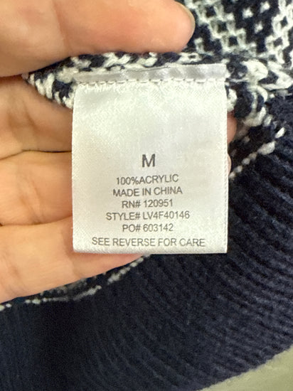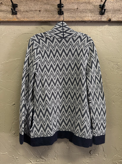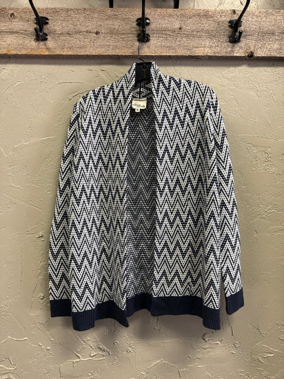Description : Open-front knit cardigan sweater in navy and white with a bold zigzag/chevron pattern, ribbed cuffs and hem, long sleeves, and a slightly raised collar opening