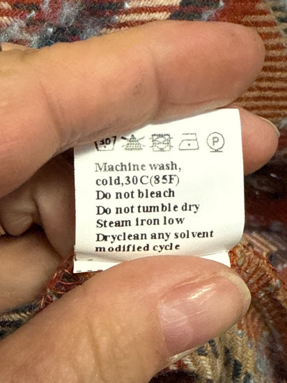 Description : Button-front plaid shacket in warm rusty orange and camel tones with navy and cream accent lines, featuring a spread collar, long sleeves, two chest flap pockets with buttons, and brown buttons down the front