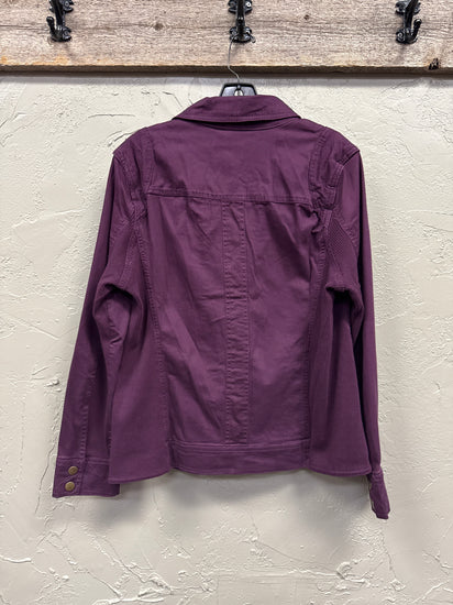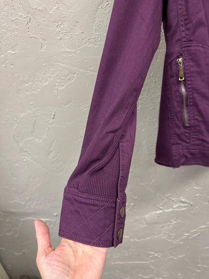 Description : New without tags, moto-style jacket in perfect Fall colors with a pointed collar, asymmetric front zipper, long sleeves, and zippered side pockets with visible metal hardware
