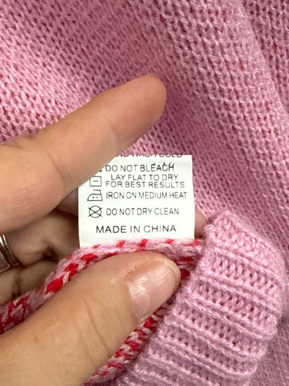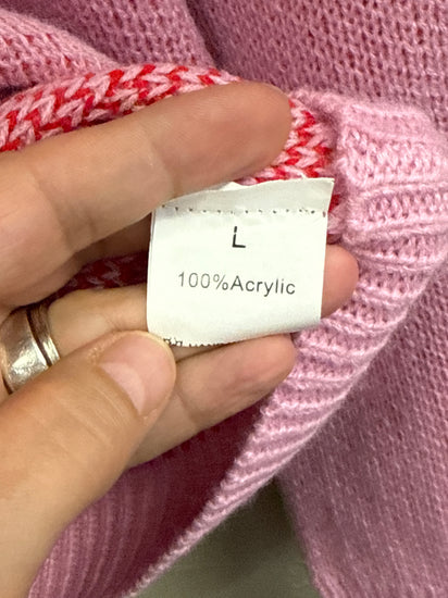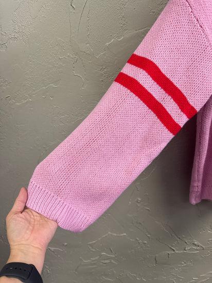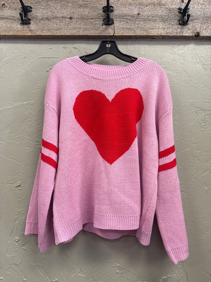 Description : Oversized knit crewneck sweater in light bubblegum pink with a large solid red heart centered on the chest and two red athletic-style stripes on each sleeve; ribbed neckline, cuffs, and hem with a relaxed, boxy fit