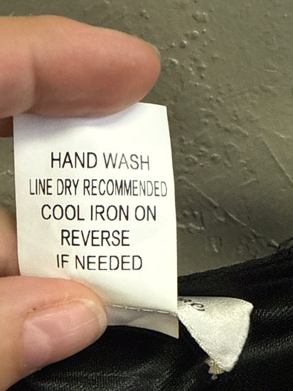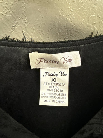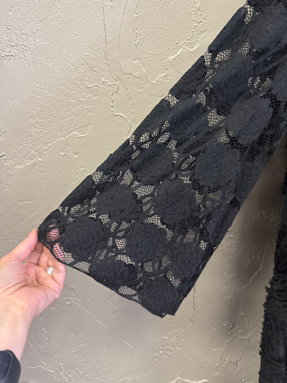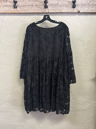 Description : Black tiered lace dress with a V-neck, long semi-sheer sleeves and a gathered, multi-tier skirt with an opaque lining in the bodice.