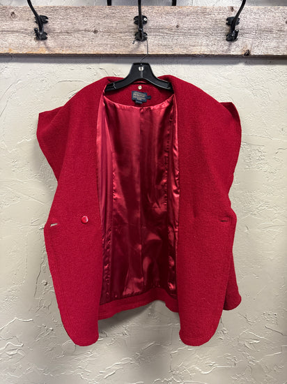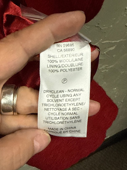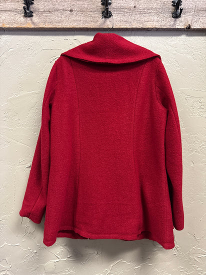 Description : A mid-length red wool coat with a wide shawl collar, double-breasted front with one visible button, and rounded patch pockets. The silhouette is slightly tailored with long sleeves and a relaxed fit