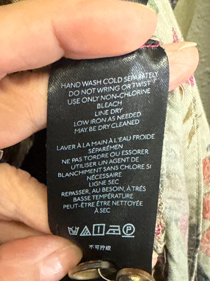 Description : Long-sleeve button-up shirt in mixed prints: camo shoulders and sleeves, a leopard-print panel on the left front, and a floral panel with pink, purple and blue blooms on the right front, featuring two chest flap pockets and a slightly worn, patchwork aesthetic.