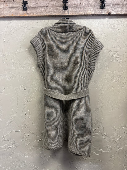 Description : Sleeveless long knitted cardigan vest in a medium gray-taupe color with a wide shawl collar, ribbed stitch texture and a matching knit belt tied at the waist; front is open with long vertical panels and slightly dropped armholes