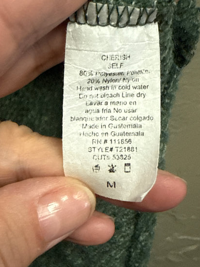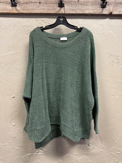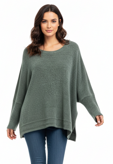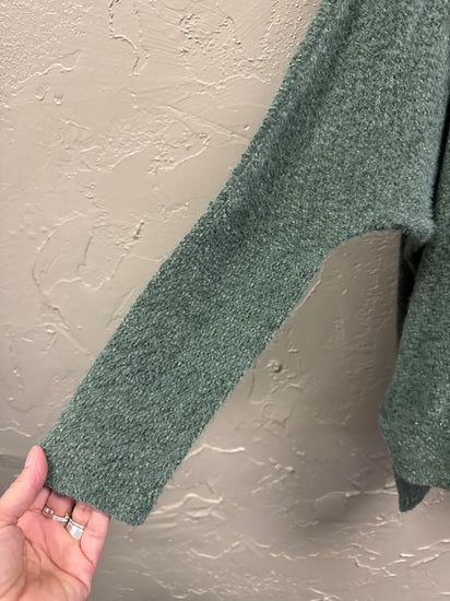 Description : A long-sleeve, loose-fitting knit sweater in a muted deep green with a round neckline, textured bouclé-like fabric, and a slightly longer, layered hem at the back.