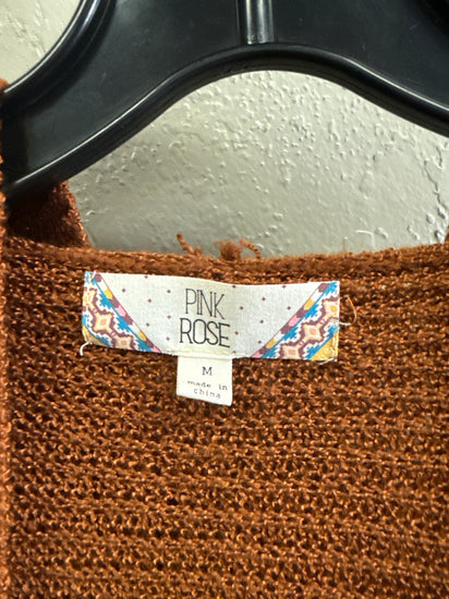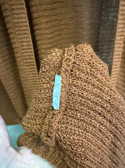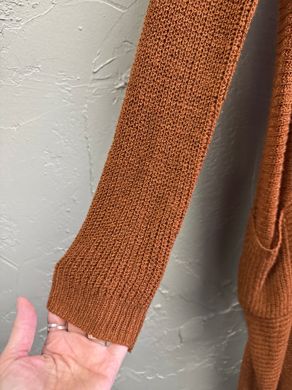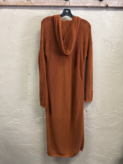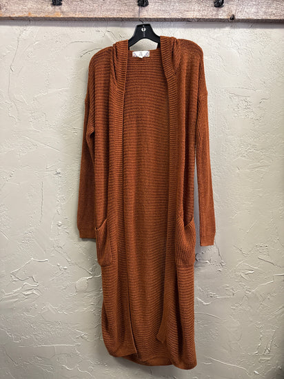 Description : Long open-front hooded cardigan in a rusty orange knit with long sleeves, ribbed trim and two front patch pockets.