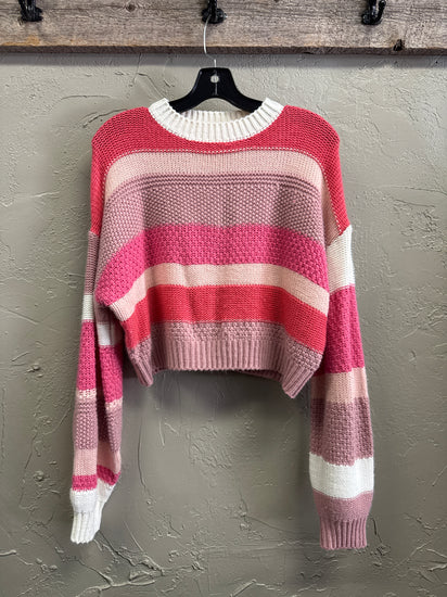 Description : Knit cropped sweater in horizontal pink, coral, blush and white stripes with a ribbed crew neckline, ribbed hem and long sleeves in a chunky textured stitch.