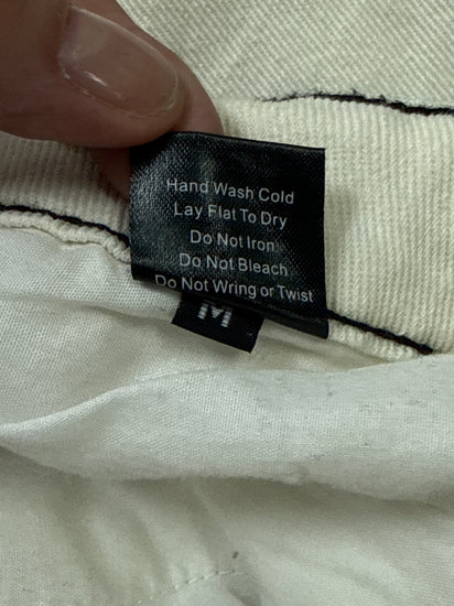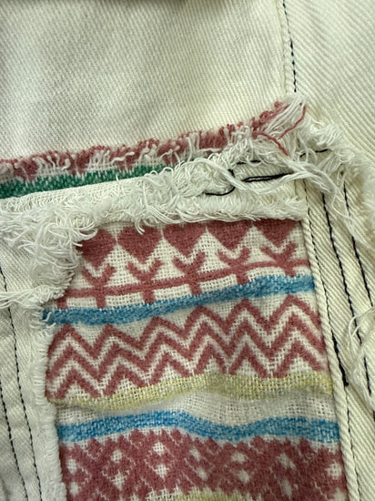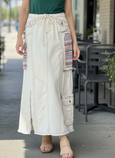 Description : Cream-colored denim maxi skirt with contrasting dark stitching, featuring two zippered pockets and decorative embroidered patches with hearts and geometric patterns on the sides. The hem is frayed, and it has a drawstring waist.