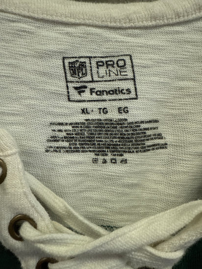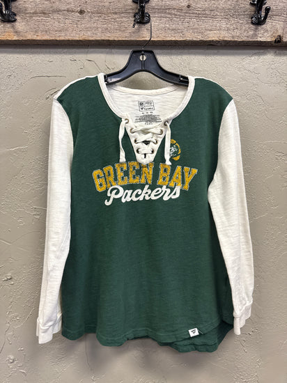 Description : Long-sleeved shirt with a forest green body, cream sleeves and a lace-up neckline.