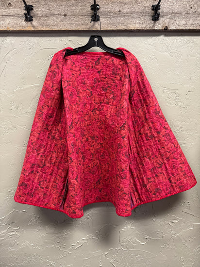 Description : Long-sleeve patchwork jacket in vibrant pinks, magentas, reds and touches of blue with vertical quilted strips, a round neckline, two front toggle frog closures, and welt pockets at the hips. The fabric is a medium-weight quilted cotton with a textured, batik print and contrast binding at the edges.