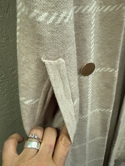 Description : Long sleeveless beige longline vest coat with a white windowpane check pattern, wide notched lapel, and double-breasted front featuring two columns of brown buttons. The front also shows vertical welt pockets and a straight hem falling to midi length.
