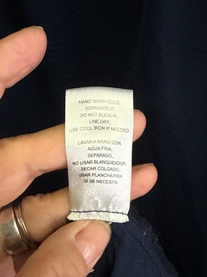Description : Maxi dress in a deep navy blue with a collared, button-front bodice, long sleeves with slightly gathered elastic cuffs, and a tiered, gathered skirt creating a flowing silhouette. The fabric is slightly textured and lightweight.