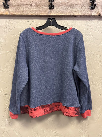 Description : Long-sleeve crewneck sweatshirt in heathered navy blue with contrasting red ribbed neckline, cuffs, and a red tie-dye hem. All recycled material.