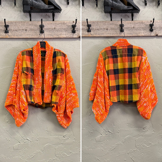 Description : A cozy open-front jacket combining reclaimed flannels and vintage blankets; created to have a relaxed, boxy silhouette and perfect for layering!