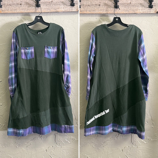 Description : Long-sleeve dresses featuring a round neckline and a relaxed, slightly A-line silhouette. Each is made in-house from recycled tee shirts and flannels.