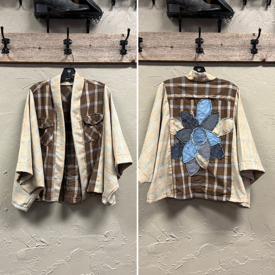 Description : A cozy open-front jacket combining reclaimed flannels and vintage fabrics; created to have a relaxed, boxy silhouette and perfect for layering!