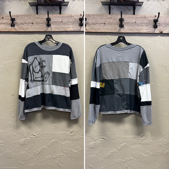 Description : The Patchwork Pullover is hand made in house from upcycled & reclaimed graphic tees. These pieces feature a unique patchwork design with the classic crewneck. Each piece is one-of-a-kind, making it both environmentally friendly and fashionably individual.