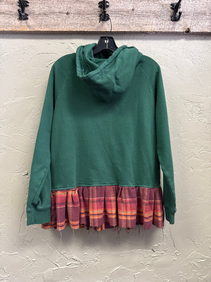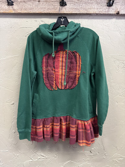 Description : Long-sleeve forest green hooded sweatshirt with drawstrings, a large distressed plaid pumpkin patch centered on the chest, and welt front pockets. The hem is finished with a gathered maroon-orange plaid ruffle that peeks out below the sweatshirt