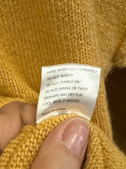 Description : Mustard yellow, crew-neck sweater with dropped shoulders and a seam running down the center front.