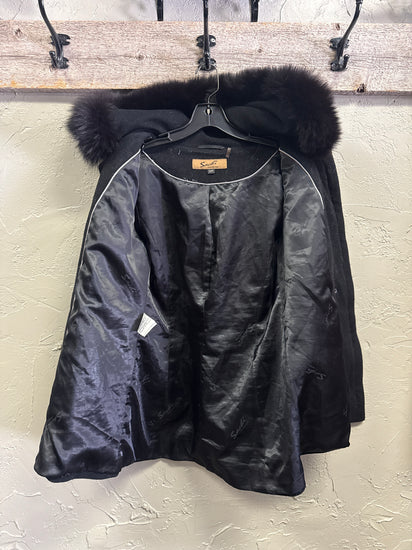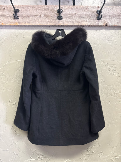Description : Plush, silky fox fur trimming the attached hood is an elegant addition to a simply styled coat crafted from a polished lambswool blend.