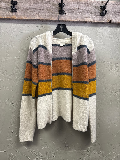 Description : Hooded zip-up cardigan in a cozy knit texture, features horizontal stripes in cream, rust, mustard, lilac & navy. Ribbed hem and cuffs, cropped length, open front