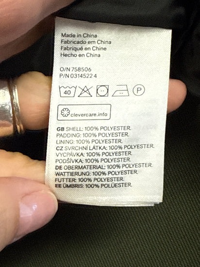 Description : Army green bomber jacket with a front zipper, ribbed collar and hem, quilted sleeves, and angled front pockets.