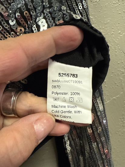 Description : Long-sleeve cropped top in metallic silver with vertical sequin texture, a round neckline, and a slightly boxy silhouette