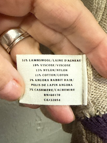 Description : A long-sleeve open-front cardigan in a muted taupe-beige with a contrasting dark plum trim; features layered ruffle panels along the front opening and a striped plum-and-taupe hem detail for a decorative, feminine look.