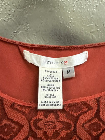 Description : A rust-red, knee-length shift dress with a scoop neckline and three-quarter sleeves; features darker embroidered floral-geometric bands down the center front, at the waist, hem and sleeve cuffs on a textured woven fabric with a slightly sheer underlayer at the hem.