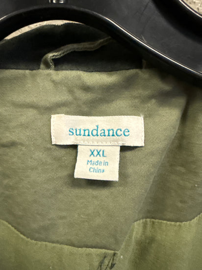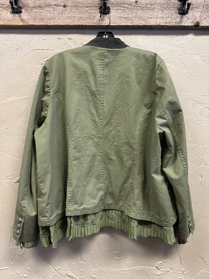 Description : SUNDANCE olive green jacket with a dark green collar and pocket trim. It features decorative buttons on the cuffs and a ruffled, patterned hem.