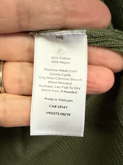 Description : Long-sleeved olive green V-neck cardigan with a button-up front and ribbed cuffs and hem