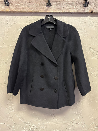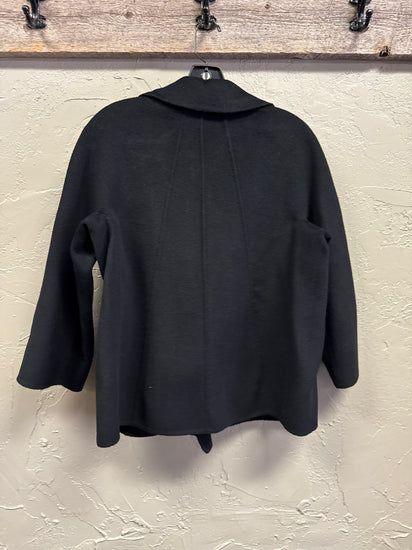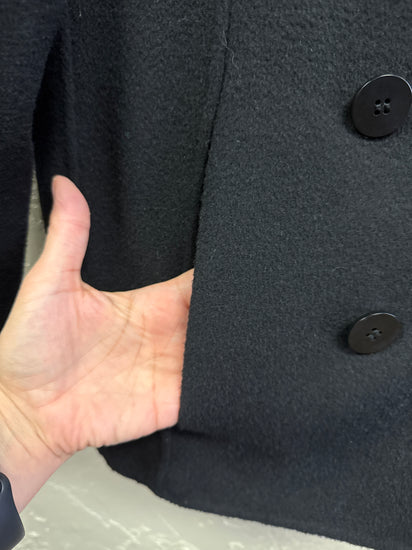 Description : A double-breasted, hip-length wool coat in deep black with wide notch lapels, three rows of front buttons (six total) and a slightly A-line silhouette with long sleeves. The front features clean vertical seams and welt pockets for a structured, classic peacoat look.