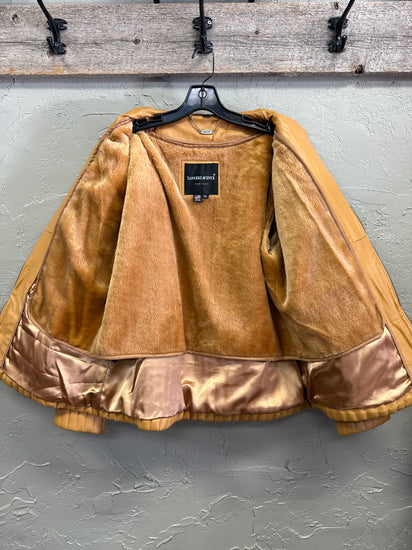 Description : Mustard colored quilted leather jacket with vertical stitching, zippered front and removable faux fur lining