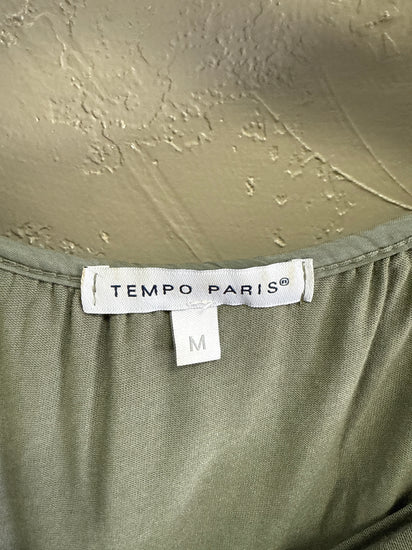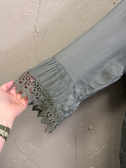 Description : Tiered tunic top featuring a V-neck with crochet detailing, sequins, and lace trim on the sleeves and hem.