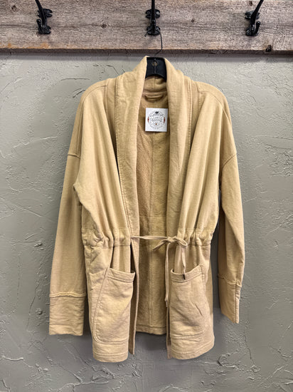Description : Light tan open-front cardigan or sweatshirt jacket with a shawl collar, long sleeves, and a drawstring waist. Front patch pockets and a relaxed, slightly slouchy cotton-fleece fabric give it a casual, cozy look