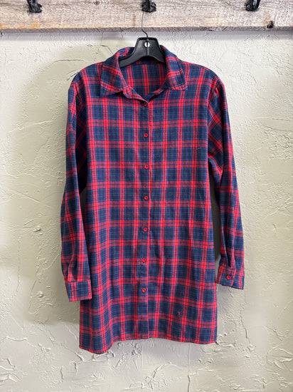Description : Long button-up plaid shirt in red and navy blue with a spread collar, long sleeves with cuffs, and a full-length front button closure; the fabric is soft and slightly brushed. The pattern is a bold check with evenly spaced vertical and horizontal lines